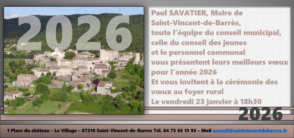 Paul Savatier, Maire de Saint-Vincent-de-Barrès, toute l’équipe du conseil municipal, celle des jeunes et le personnel communal, vous présentent leurs meilleurs vœux pour l’année 2026, et vous invitent à la cérémonie des vœux au foyer rural le vendredi 23 janvier 2026 à 18h30.